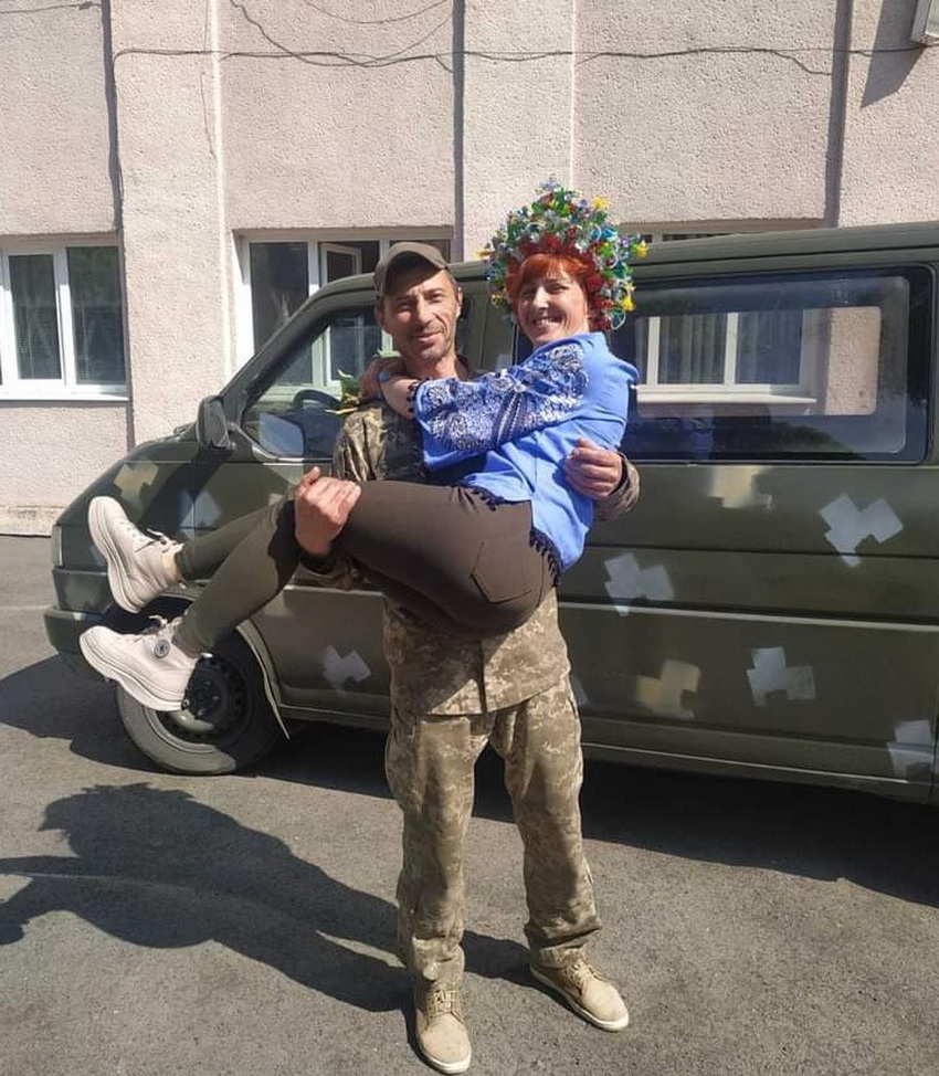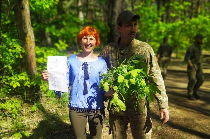 «Це було 12 травня. Ми прийшли в глиб лісу і командир бригади провів нам шлюбну церемонію. А ще в мене був оригінальний весільний букет із лісових трав та квітів. Правда, обручок в нас не було. Ми вирішили, що вже під час вінчання обміняємось ними. Побратими мого чоловіка були вражені моєю сміливістю, що я подолала стільки шляху і привезла автомобіль. А я скажу –це все через кохання. Заради свого чоловіка, я готова їздити щотижня на передову. І ось зараз, збираю нову посилку нашим воїнам, аби перемога настала якомога швидше», - говорить Євгенія.
