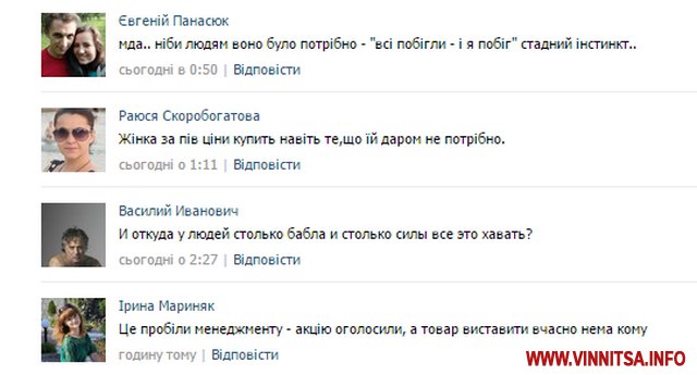 Вчора і сьогодні вінничани почали викладати в соцмережі фото з вчорашнього шопінгу. В коментарях користувачів під фото багато нецензурних слів. Виходить, вінничани отримали сумнівне задоволення від шопінгу та заощадження кількох гривень.