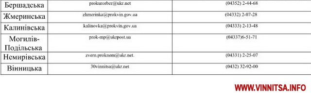 Електронні звернення та звернення на телефон «гарячої лінії» можна направляти на відповідні електронні адреси та телефони місцевих прокуратур:
