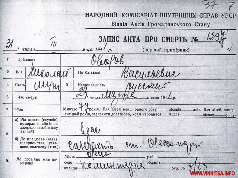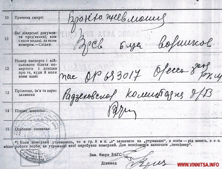 У документі були вказані рід занять померлого (лікар), місце роботи (санчастина станції «Одеса-порт»), місце постійного проживання (м.Одеса, вул. Комінтерна 8/13) та інші персональні дані.