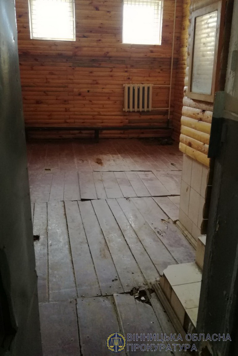 Не відповідає санітарним нормам душова кімната, де дерев’яне покриття підлоги пошкоджене, окремі дошки прогнилі, фарбо покриття підлоги пошкоджене та не оновлене, санітарне прибирання належним чином не здійснюється.