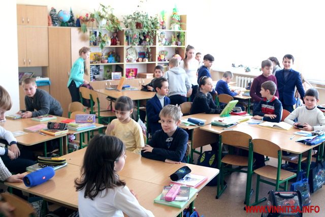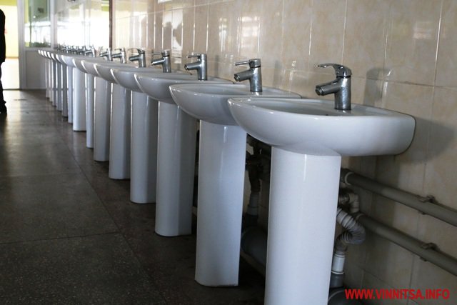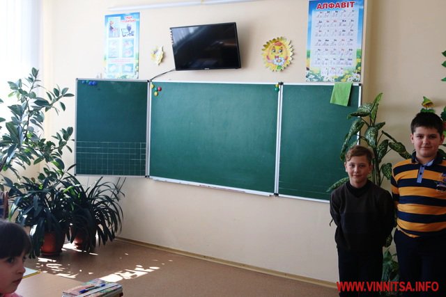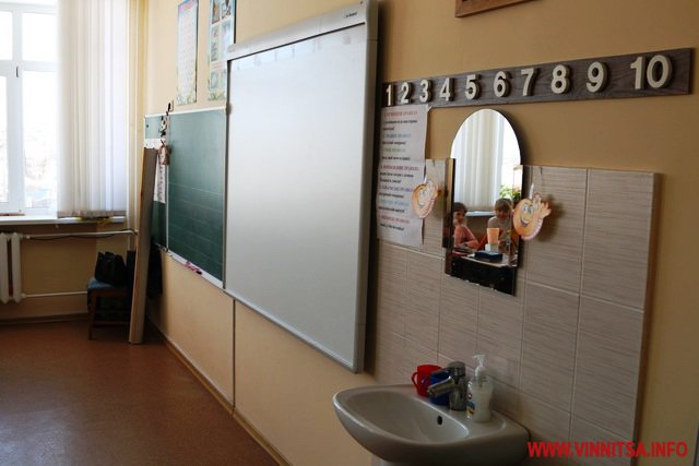 У кожній класній кімнаті плазмовий екран над дошкою. Нові шафи, полиці. При вході умивальник.