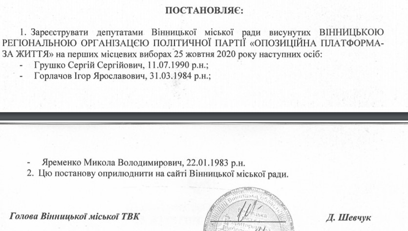 6. Визнати обраним депутатом Вінницької міської ради Вінницького району Вінницької області на перших місцевих виборах 25 жовтня 2020 року від ВІННИЦЬКОЇ РЕГІОНАЛЬНОЇ ОРГАНІЗАЦІЇ ПОЛІТИЧНОЇ ПАРТІЇ «ОПОЗИЦІЙНА ПЛАТФОРМА-ЗА ЖИТТЯ» - Яременко Микола Володимирович -22.01.1983р.н., освіта вища, безпартійний, ПАТ «Вінницягаз», Керівник Вінницького відділення, проживає в м. Вінниці», - зазначено в Постанові.