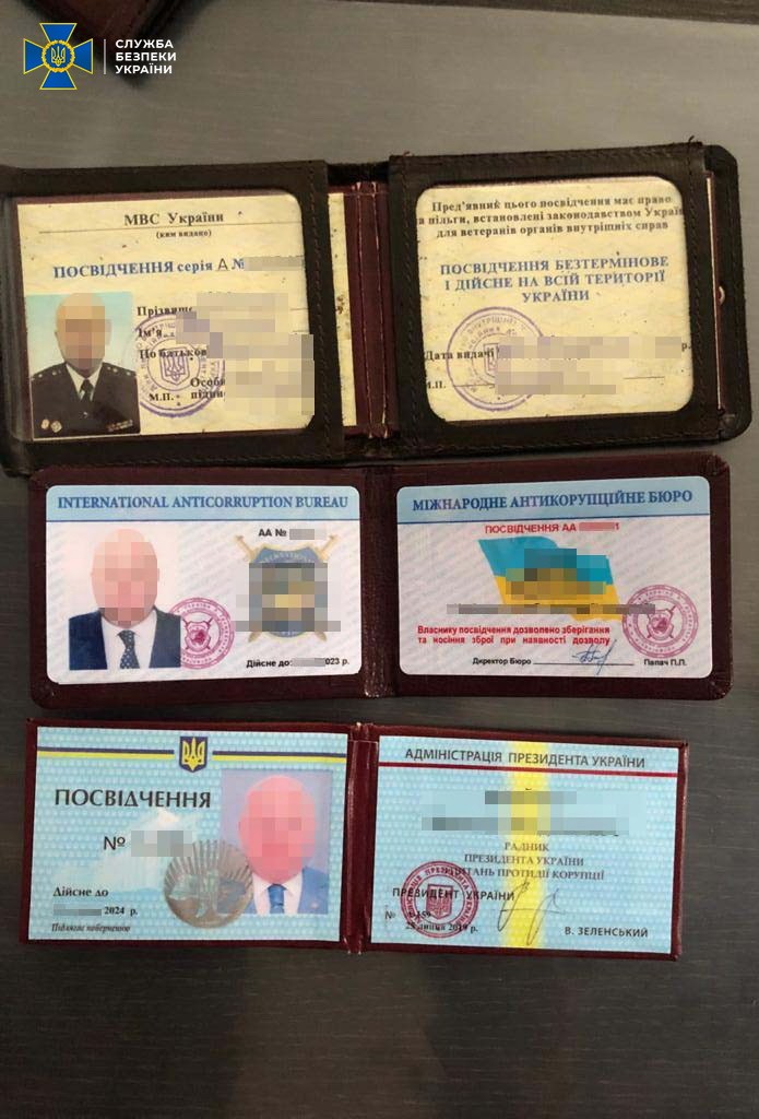 У затриманих вилучили пристрій для відстрілу гумових куль та підробне посвідчення радника Президента.