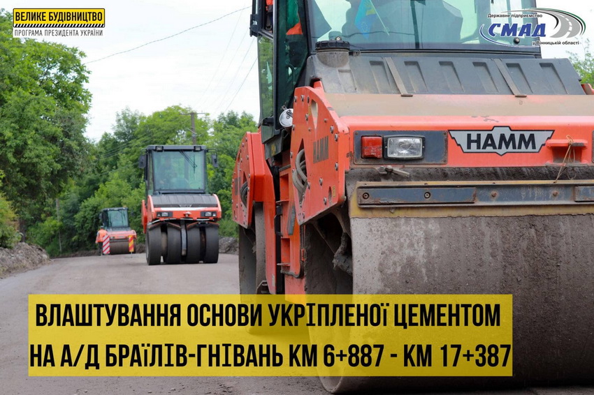 У рамках програми Президента України Володимира Зеленського «Велике будівництво» продовжується ремонт 17,387 км ділянки автомобільної дороги загального користування місцевого значення О-02-06-02 Браїлів-Гнівань.