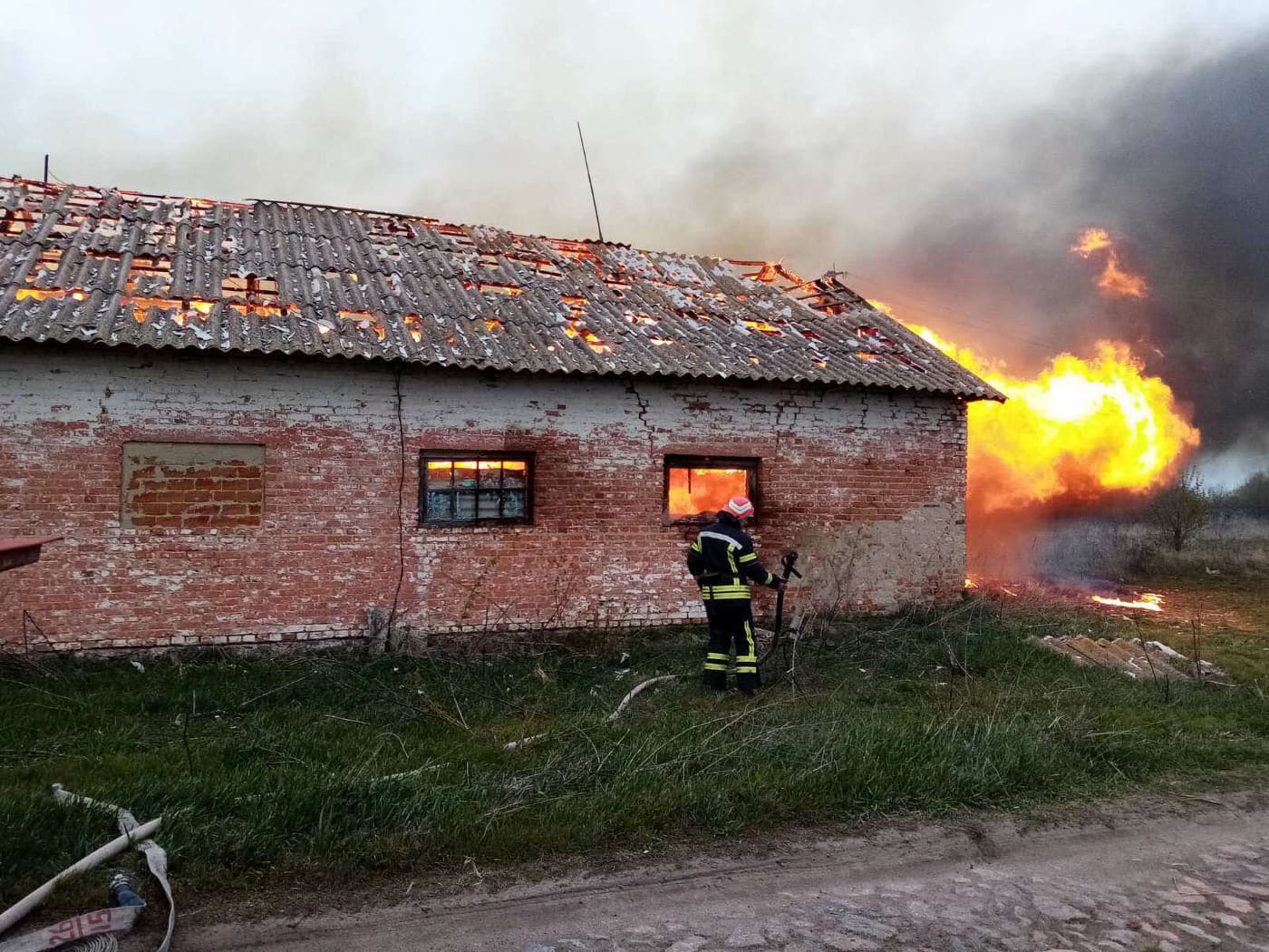 Вогонь знищив шиферну покрівлю будівлі на площі 630 кв.м., сільгогосподарську техніку та поголів'я свиней (15 голів).