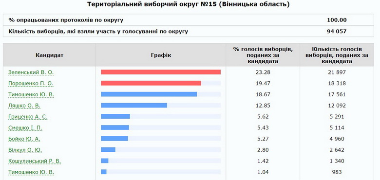 Мешканці Мурованокуриловецького, Томашпільського, Тульчинського, Чернівецького та Шаргородського районів, які входять до 15-го виборчого округу на Вінниччині проголосували за Володимира Зеленського. На другому місці – Петро Порошенко, на третьому – Юлія Тимошенко.