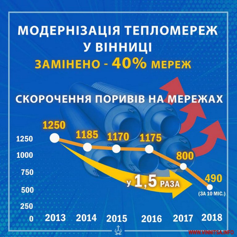 У Вінниці продовжують проводити роботи з модернізації систем теплопостачання. На сьогодні в цілому у місті уже замінено 40% зношених теплотрас. Завдяки цьому зменшилась кількість поривів. Втрати теплової енергії у попередньо ізольованих трубах зводяться до мінімуму - не більше 4%.