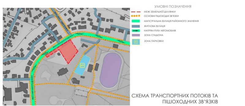 В презентації проекту показано, що будівля буде розташована в Центральному парку на ділянці, площею 0,6 га, неподалік існуючої парковки. На кадастровій карті, яка у відкритому доступі, на зазначеній місцевості кілька земельних ділянок, по 0,1 га, які в приватній власності та кілька – в комунальній власності.