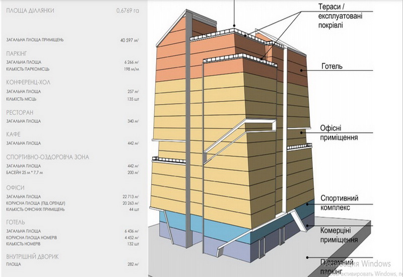 Там планують розмістити готель, офіси, ресторан, конференц-хол, спортивно-оздоровчу зону і підземний паркінг.