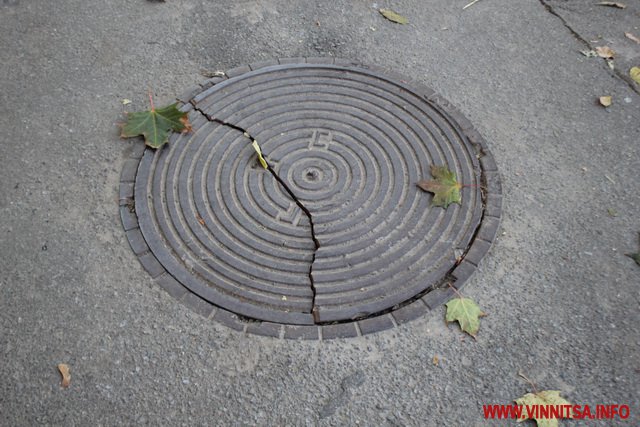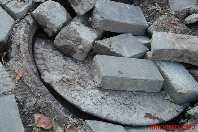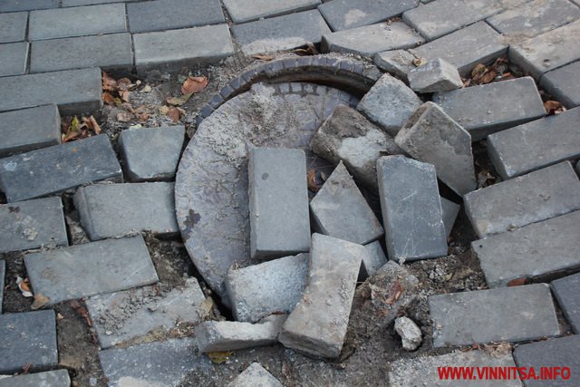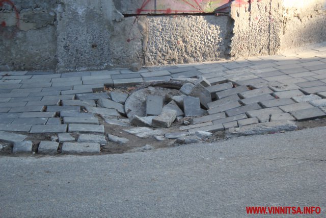 У Вінниці на вулиці Монастирській провалився люк. За словами людей, які поруч працюють, яма на тротуарі утворилася близько тижня тому, плитка навкруги розтрощена.