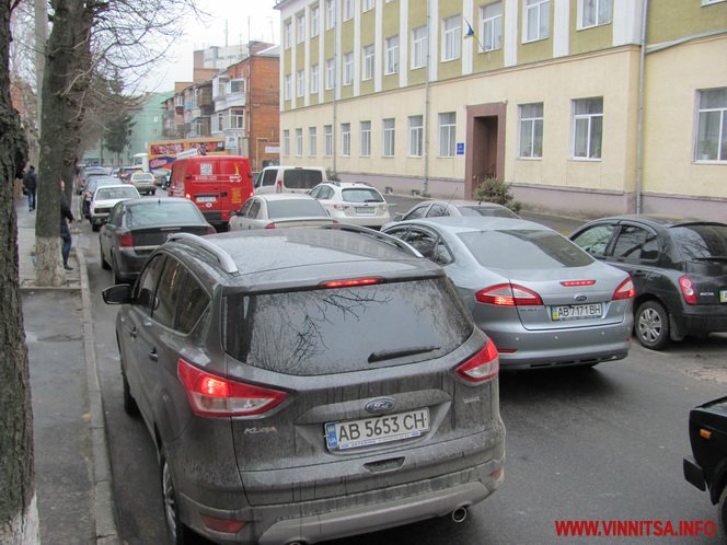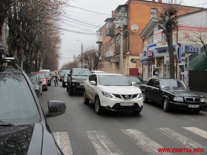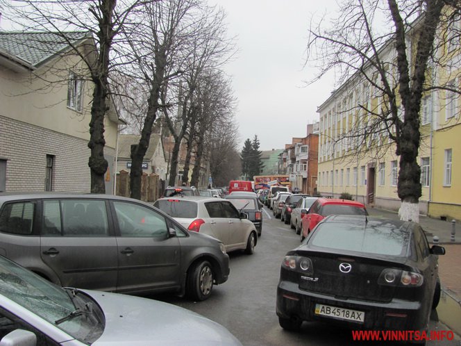 Оскільки рух на Грушевського односторонній, то затор тягнеться ще з вулиці Миколи Оводова (колишня Козицького). Дехто обминає заблоковану ділянку тротуаром і газоном.