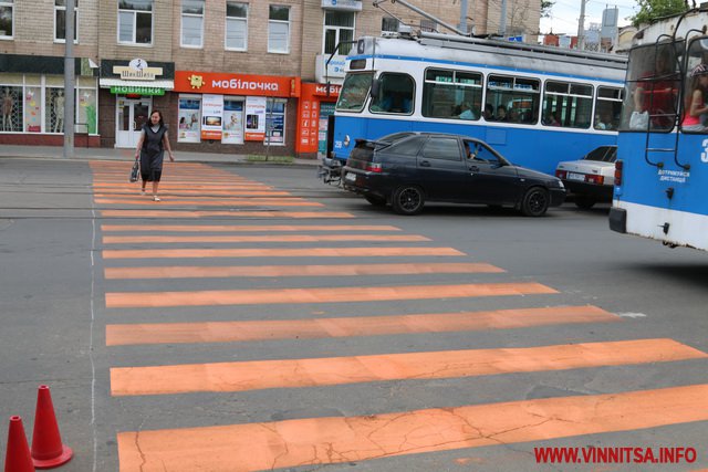 Новий перехід має помаранчевий колір, адже розмітка тимчасова – на 3 місці. Поки що старий перехід замалюють, а по закінченню ремонтних робіт все повернуть на свої місця.