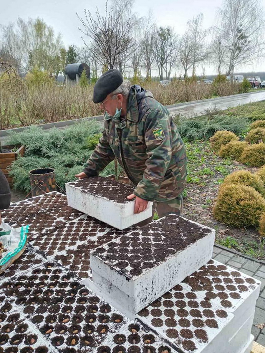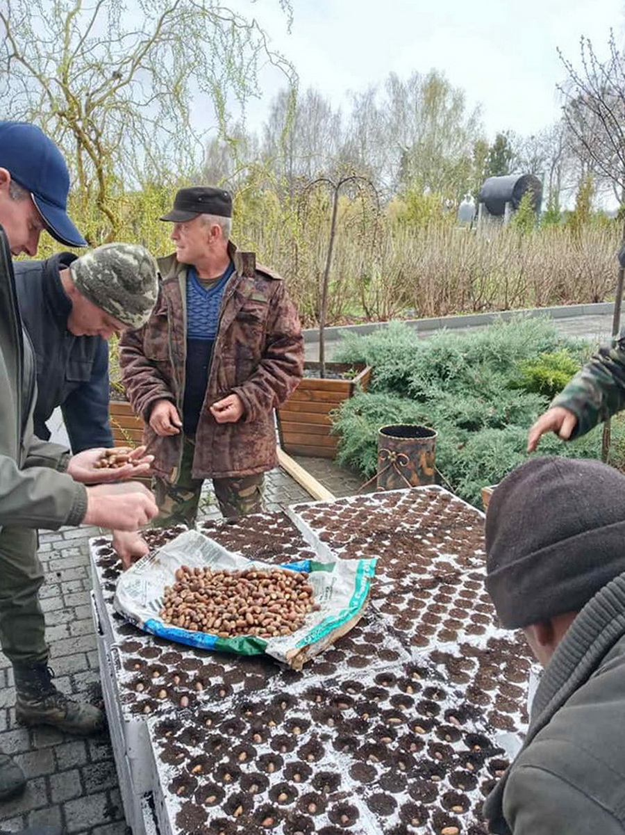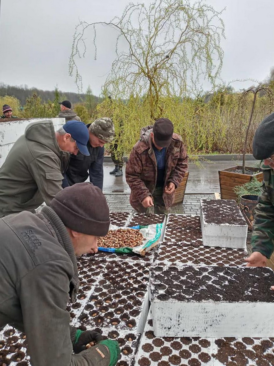 Висівання жолудя у палети – це виключно ручна праця, яка потребує чималої ретельності і затрат часу. Усього до палет закладено 40 тисяч насінин для вирощування сінців із ЗКС – майбутніх дубів, які вже наступного року пересадяться на лісову ділянку.