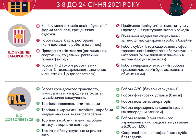 Відсьогодні, з 8 січня, в Україні почав діяти жорсткий карантин. Триватиме він до 24 січня (включно). Запровадили локдаун для того, щоб запобігти великого поширення коронавірусу після новорічних свят. В містах України закриють ресторани, торгові центри, заклади освіти, окрім дитсадків. Громадський транспорт працюватиме і надалі.