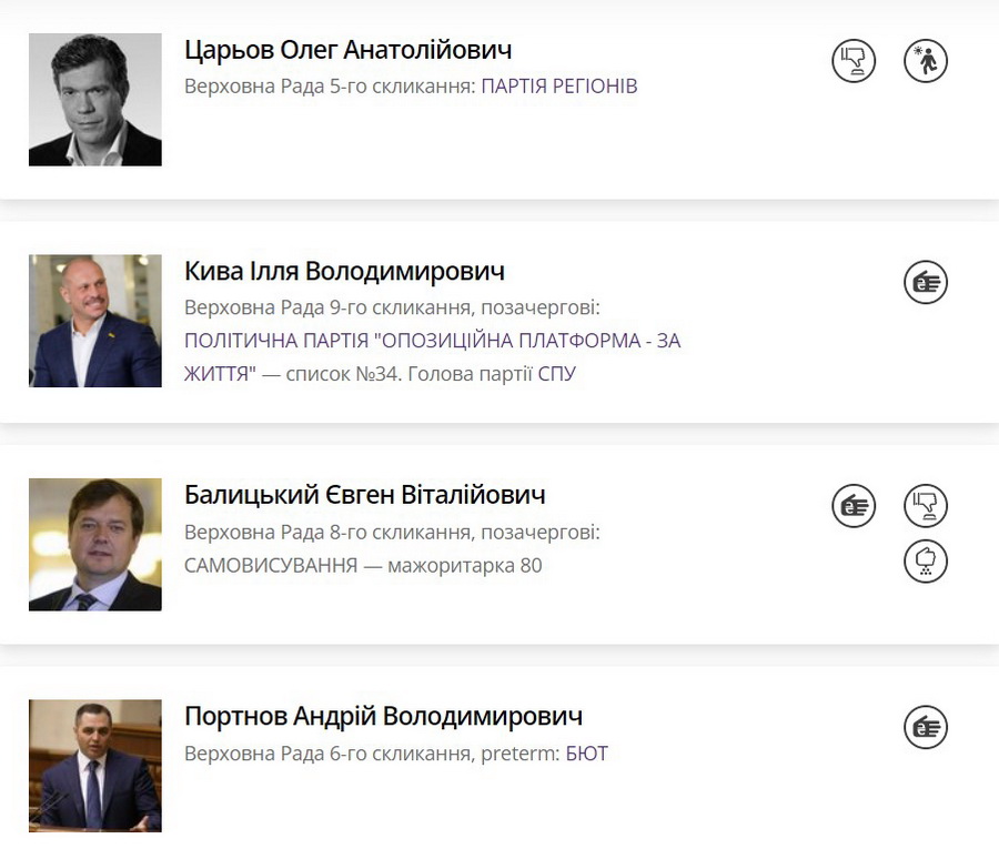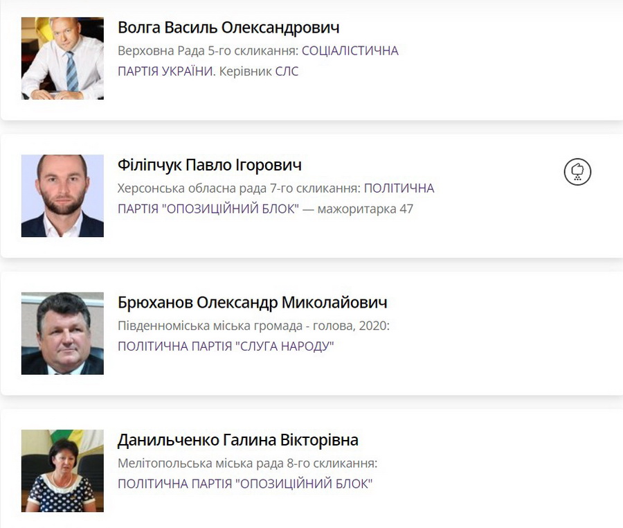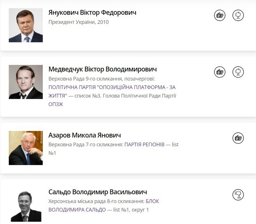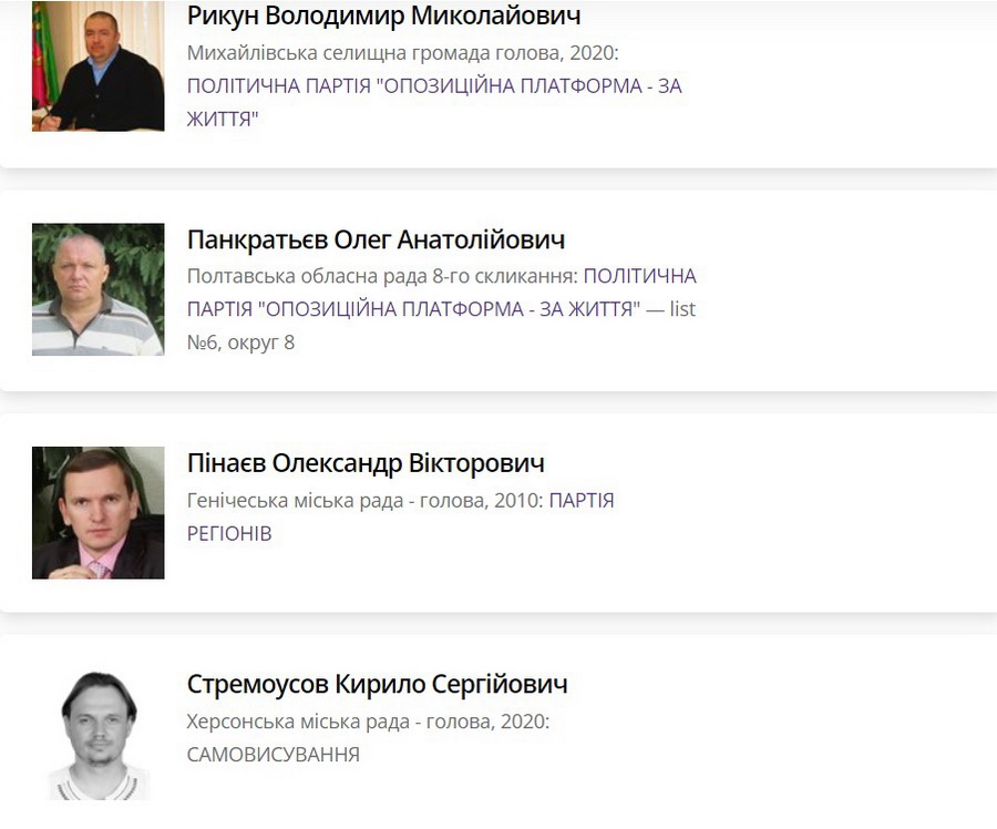 До реєстру вже увійшли 17 осіб. Серед інших – уже колишній нардеп Ілля Кива від ОПЗЖ, депутатка Мелітопольської міськради Галина Данильченко з Опозиційного блоку, мер Куп’янська Геннадій Мацегора, один з лідерів ОПЗЖ Віктор Медведчук, екснардеп Євген Балицький та інші – як давно знайомі, так і нові імена.