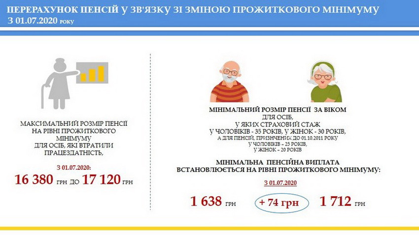 З 1-го липня мінімальна пенсія за віком для непрацюючих пенсіонерів, які мають повний страховий стаж (жінки – 30, чоловіки – 35 років, до 01.10.2011 жінки – 20, чоловіки – 25 років), становитиме 1712,00 грн. Для осіб, пенсія яких перевищує зазначений розмір прожиткового мінімуму, перераховано доплату за понаднормовий стаж.