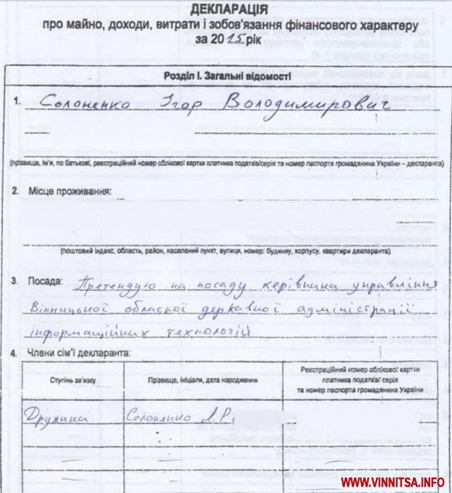 Відповідно до декларації про доходи і витрати за 2015 рік, яка розміщена на сайті Вінницької ОДА, Ігор Солоненко не заробив нічого, не задекларовано доходів і в членів його родини (дружина).
