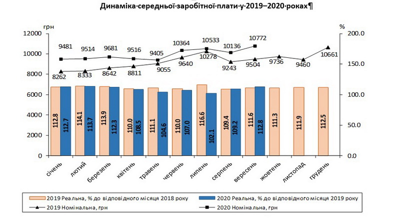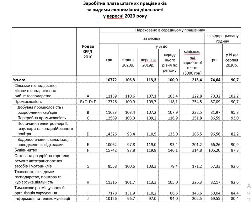 Середня номінальна заробітна плата штатного працівника підприємств, установ та організацій у вересні 2020 р. становила 10772 грн, що в 2,2 раза вище рівня мінімальної заробітної плати (5000 грн). Порівняно з серпнем 2020 р. розмір середньої номінальної заробітної плати збільшився на 6,3%, а за останні 12 місяців (відносно вересня 2019 р.) – на 13,3%.