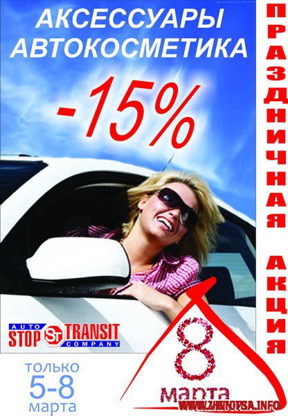 Автомагазины компании «Стоп-Транзит» 5-8 марта проводят праздничную акцию. В эти дни автоаксессуары и автокосметика продаются с 15% скидкой. А каждая очаровательная покупательница получит подарок.