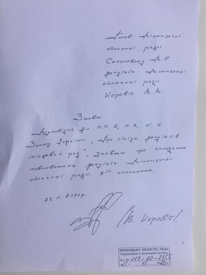 Валерій Коровій повідомив про складання повноважень депутата Вінницької обласної ради 8 скликання. Він опублікував на своїй сторінці в «Фейсбук» заяву на ім’я голови облради В’ячеслава Соколового. Нажаль, кореспонденту Вінниця.info не вдалось додзвонитись до Валерія Вікторовича, щоб уточнити деталі (абонент поза зоною досяжності). Тому публікуємо допис з його сторінки та фото заяви. Вінницька облрада тепер визначатиметься, хто буде головою бюджетної комісії. Адже на цю посаду на першій сесії обрали Валерія Вікторовича (Українська стратегія Гройсмана).