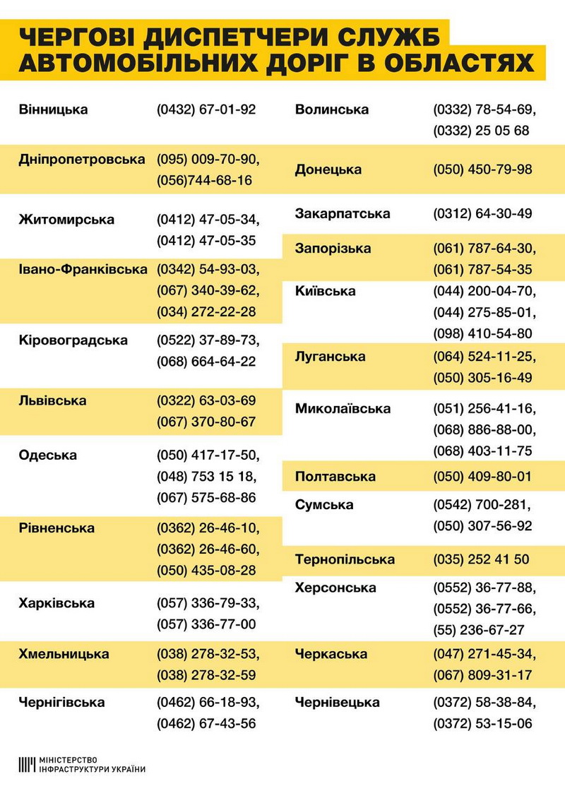У разі виникнення надзвичайних ситуацій, пов’язаних з ускладненням руху через погодні умови, водії повинні звертатись до чергових диспетчерів служб автомобільних доріг у своїй області. Телефон у Вінницькій області: +38 0432 67 01 92. Телефони інших областей в таблиці: