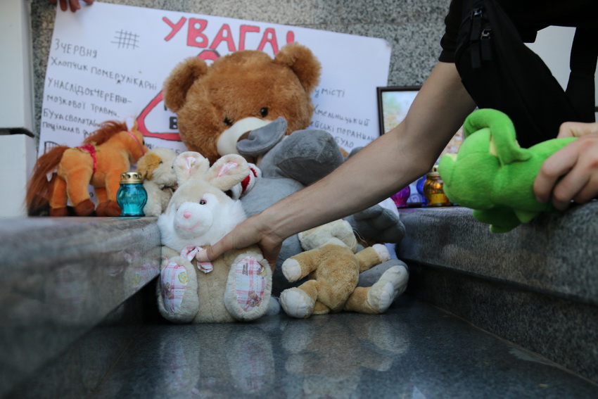 Під стінами поліції залишили плакати, іграшки, запалені лампадки і портрет Кирила…