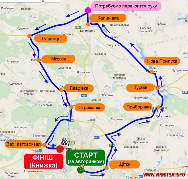 Спортсмени подорожуватимуть по кругу: м.Вінниця (крива) – Вінницькі Хутори – Стадниця – Приборівка – Турбів – Нова Прилука – Калинівка – Гущинці – Мізяків – Стрижавка – Вінниця.