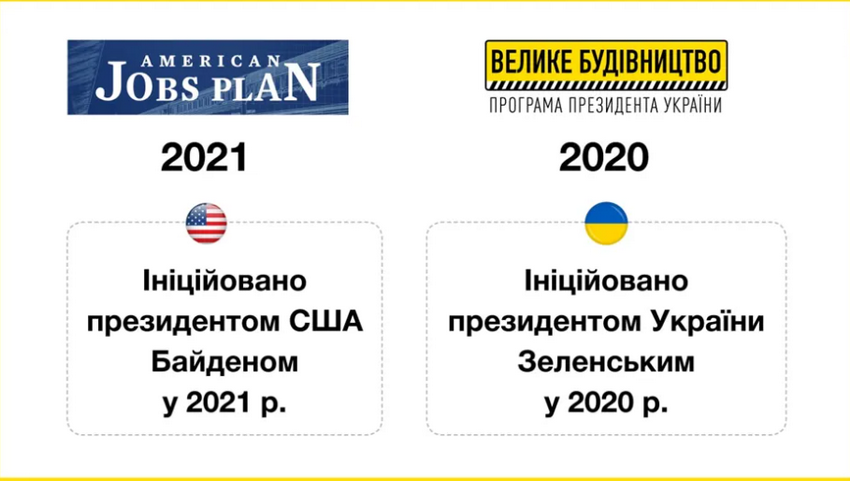 Президент України Володимир Зеленський почав Велике будівництво як основний стратегічний проєкт в перші місяці 2020 року. У 2021 році новообраний президент США Джо Байден анонсував на літо цього року старт аналогічного проєкту під назвою The American Jobs Plan, щоб "врятувати майбутнє Америки".