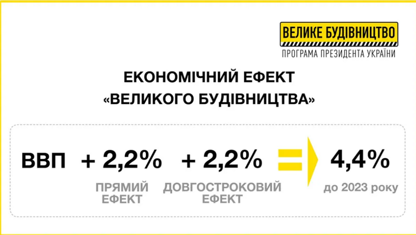 При цьому довгострокові ефекти, такі як збільшення публічного капіталу, поява нового приватного капіталу завдяки капітальному ремонту і будівництву нових доріг, а також зростання продуктивності в ключових галузях і на рівні національної економіки призведуть до збільшення ВВП в найближчі три роки додатково ще на 2,2%. Таким чином сукупний ефект від Великого будівництва – кумулятивне збільшення ВВП в наступні три роки на 4,4%.