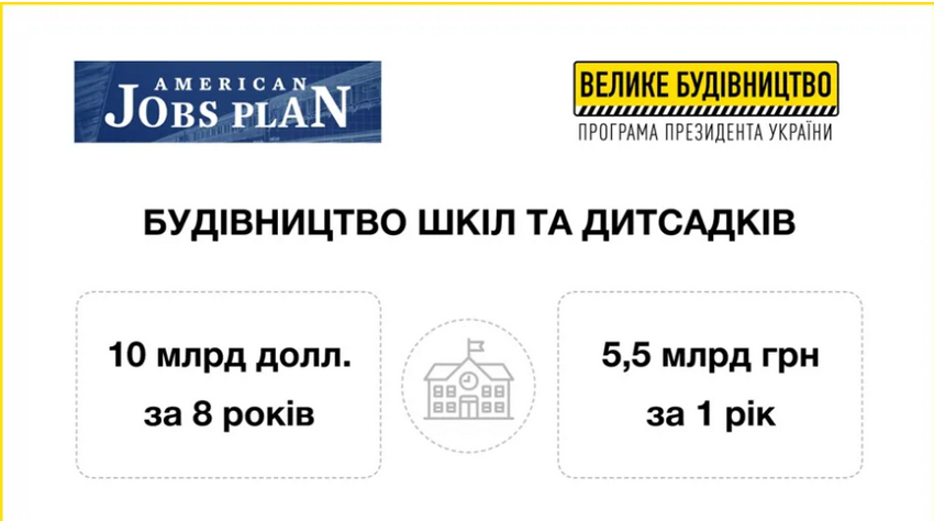 У США на будівництво і переобладнання шкіл планують виділити 100 млрд доларів. Ще 12 млрд виділять на коледжі. Список об'єктів наразі тільки на етапі складання, але повідомляється , що всього буде створено від 1 до 2 млн нових учнівських місць.