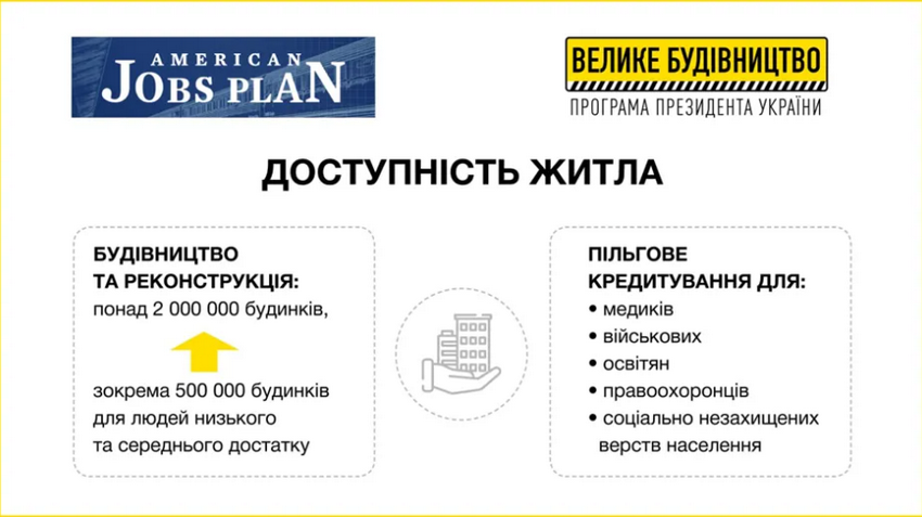 План Байдена передбачає інвестування 213 мільярдів доларів в будівництво, реконструкцію та переобладнання понад двох мільйонів будинків, включно з 500 тис. будинків для людей низького і середнього достатку.