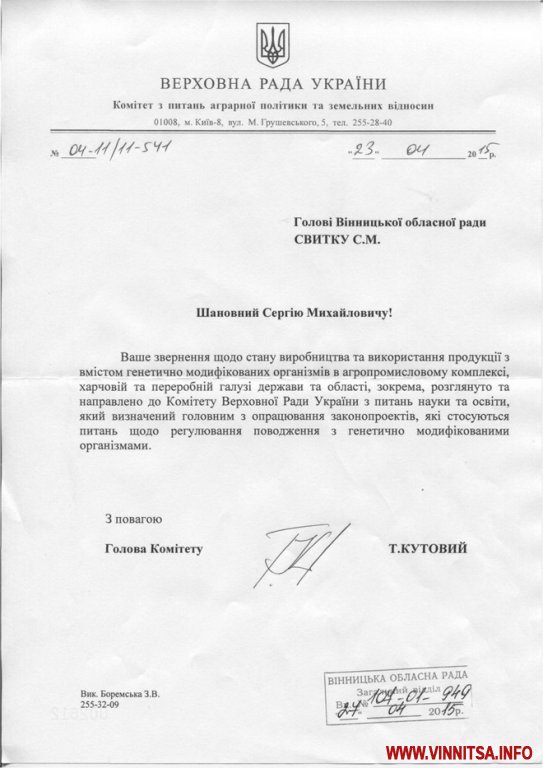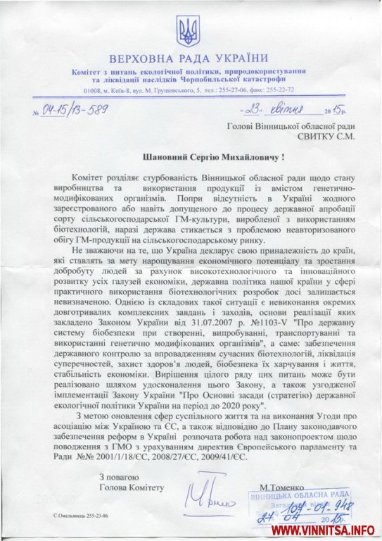 «Звернення передано для розгляду у Комітет з питань науки та освіти, який визначений головним з опрацювання законопроектів,які стосуються питань щодо регулювання поводження з генетично модифікованими організмами».