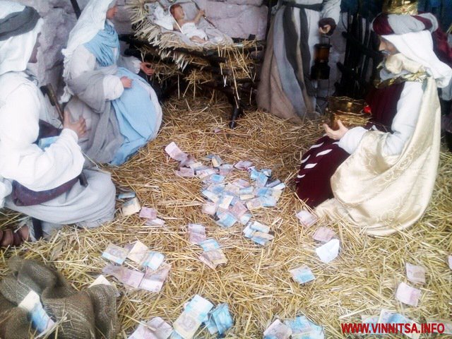 Два тижні тому у Вінниці на майдані Незалежності встановили різдвяний вертеп. Діти і дорослі з цікавістю розглядати композицію, фотографувалися поруч. Згодом серед фігурок святих почали з’являтися грошу. Купюри номіналом 1, 2, 5 гривень встелили частину вертепу.