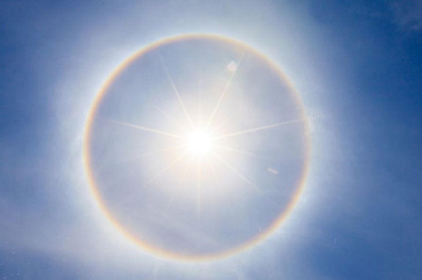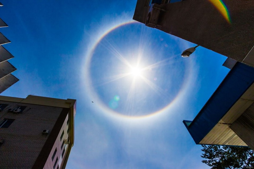 «А якщо простіше - це веселка навколо Сонця або Місяця. Однак вона утворюється не з краплинок води (як звичайна веселка), а з крижаних кристаликів. Спостерігати гало-явище можна в будь-яку пору року, вночі або вдень, навколо Сонця або Місяця, і навіть навколо ліхтарів або ламп (останнє можливе тільки в холодну погоду).