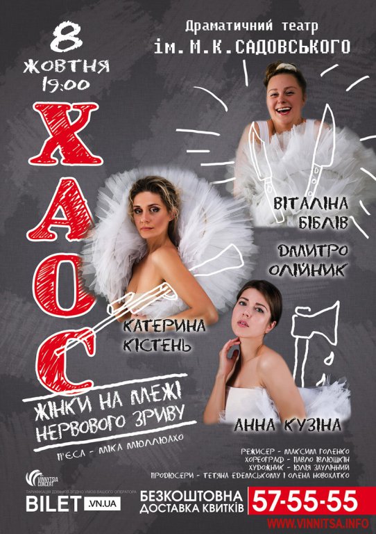 Якщо ви готові дізнатися, які демони живуть у кожній жінці, і яким ангелом вона може бути з тим, хто зуміє їх приручити, тоді поспішайте на єдиний показ у Вінниці вистави «Хаос. Жінки на межі нервового зриву» - 8 жовтня о 19.00 у Вінницькому театрі імені Садовського.