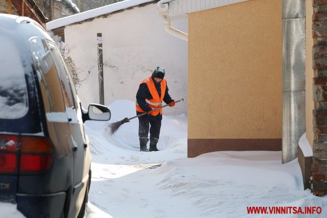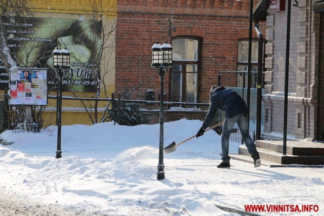 «Розгрібають» центр міста від заметів спеціальною технікою, у невеличких вулицях та біля будинків двірники працюють мітлами і лопатами.