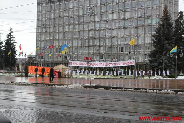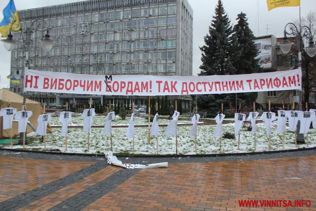 Як відомо, «тарифний майдан» був організований у Вінниці під час виборчого процесу на початку листопада. Лідер «партії пенсіонерів», яка програла вибори, Віктор Малиновський заявляв, що вони стоятимуть і після виборів, доки не доб’ються зниження тарифів на комунальні послуги. Про те, що тарифи встановлюються на державному рівні, а не на місцях, організатори акції увагу не звертали.