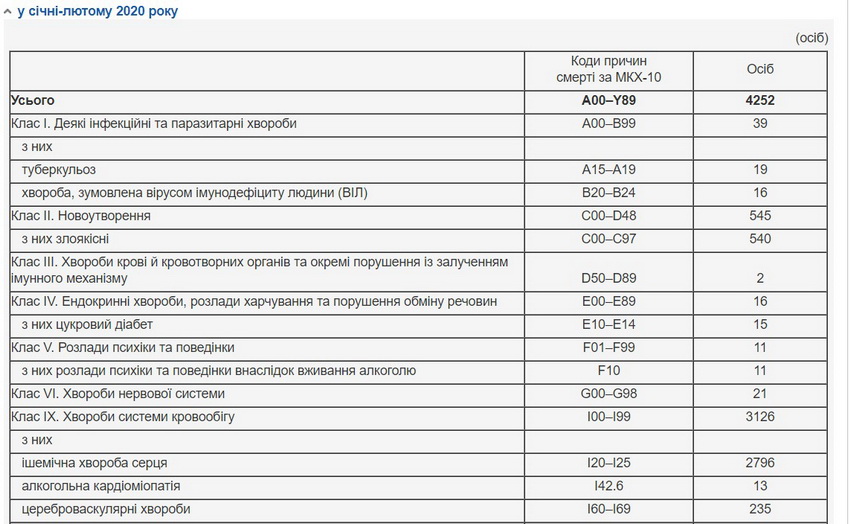 Головне управління статистики у Вінницькій області опублікувало інформацію зі статистичними даними про кількість померлих у січні – лютому 2020 року та причини смерті. Дані за березень, квітень будуть сформовані та оприлюднені після закінчення карантину.