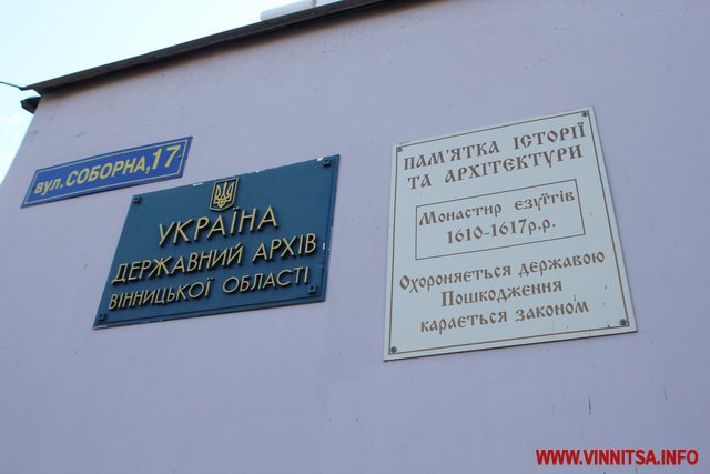 Єзуїтський монастир був побудований в 1610 році, сьогодні це вулиця Соборна, 17. За час існування будівля була монастирем, колегіумом, церквою, там навіть розміщувалася тимчасово перша Вінницька рада робітничих депутатів, а вже зараз там знаходиться Державний архів Вінницької області.