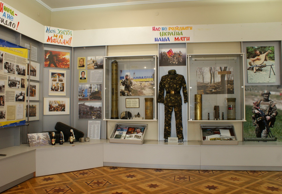 - Розділ «Вінниччина у роки Незалежності» – це віддзеркалення боротьби за здобуття Незалежності та кроки її утвердження, жахіть російсько-української війни й доль вінничан – захисників нашої держави. Ці події в експозиції ілюструють шини та «коктейлі Молотова», пробита каска, камуфляжний костюм бійця 9-го окремого мотопіхотного батальйону «Вінниця», гільзи від «Градів» і транспортно-пусковий контейнер від протитанкового керованого ракетного комплексу 9К111 «Фагот».