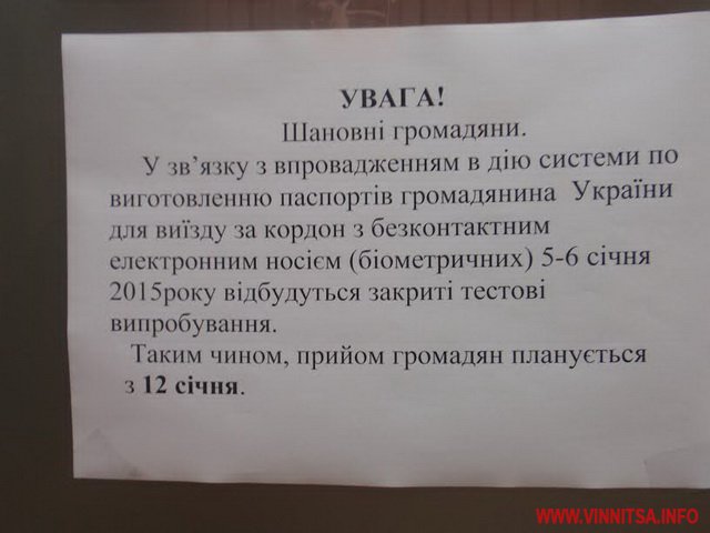 «Відповідно до умов лібералізації візового режиму ЄС для України, з 1 січня 2015 року Державна міграційна служба України розпочне оформлення біометричних паспортів для виїзду за кордон», - йшлось в «передноворічному» повідомлення ДМС. Проте 5 січня у Вінниці на Пирогова, 4 в управлінні ДМС у Вінницькій області оформити біометричний паспорт поки що не вдасться. В оголошенні вказано, що прийом громадян відбуватиметься після 12 січня, а 5 – 6 січня відбудуться закриті тестові випробування в зв’язку з впровадженням в дію системи по виготовленню біометричних паспортів.