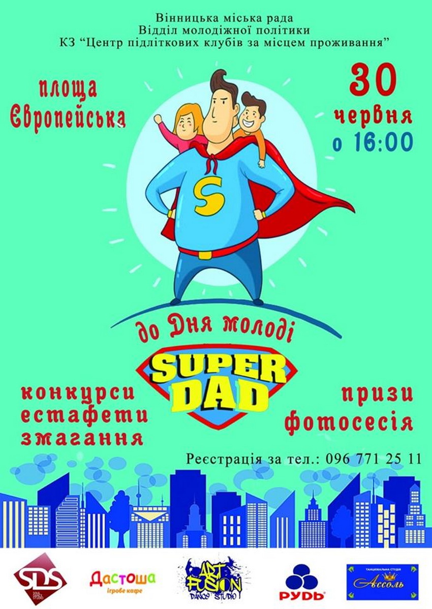 30 червня на Європейській площі відбудеться святкування Дня молоді. Організовують захід для всієї сім’ї – «Супер тато». Початок о 16 годині.
