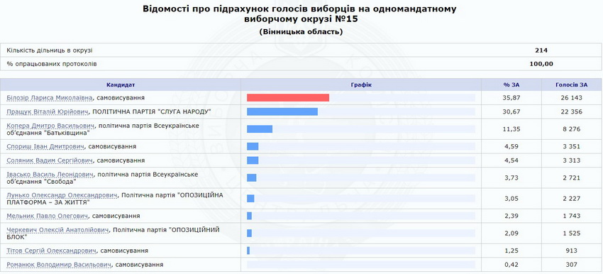 В окрузі №15 (Мурованокуриловецький, Томашпільський, Тульчинський, Чернівецький, Шаргородський райони) перемогла Лариса Білозір - 35,87% (26 143 голосів). На другому місці Віталій Паращук із «Слуги народу» - 30,67% На третьому – Дмитро Копера із «Батьківщини» - 11,35%.