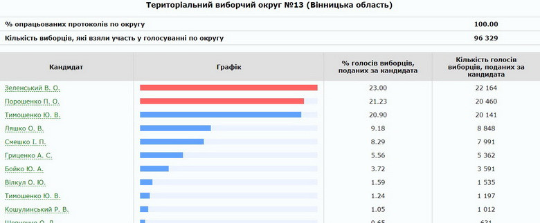 Центральна виборча комісія опрацювала всі протоколи виборчих дільниць округу №13 (Козятин, Хмільник, Калинівський, Козятинський, Хмільницький райони). Кількість виборців на ОВК №13 - 96 329 осіб. Перемогу здобув Володимир Зеленський.