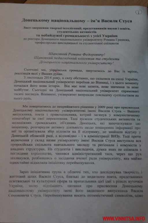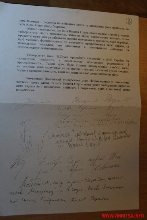 На обговоренні був представлений лист-звернення про присвоєння Донецькому національному університетові імені Василя Стуса, де підписалися близько 7 тисяч студентів. Це питання раніше вже розглядалося у 2009 році, але жодних зрушень не відбулося. Перейменування несе оптимістичний символізм, оскільки саме Вінниччина – батьківщина поета.