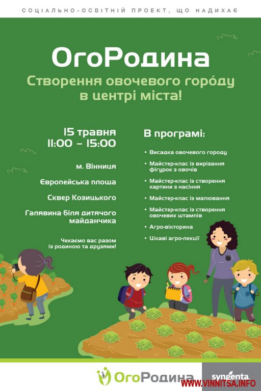 У Вінниці в рамках проекту 15 травня буде створено затишний пізнавальний простір у єднанні з природою  в самому  серці міста – «ОгоРодину». На жителів та гостей Вінниці чекають спільна висадка овочевого городу разом із спеціалістами компанії «Сингента», освітній агролекторій для дорослих, творча агромайстерня  для наймолодших. А також – тематичні вікторини та приємний родинний відпочинок.