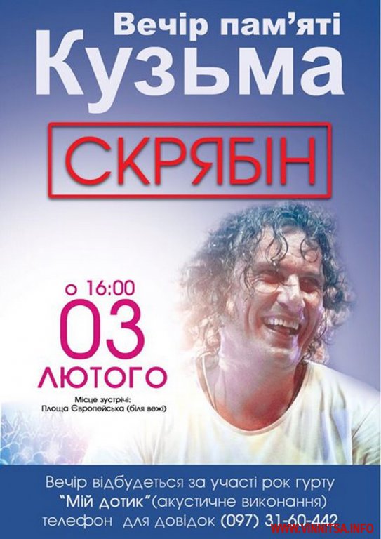 Цієї неділі у Вінниці відбудеться вечір пам'яті Кузьми Скрябіна. 3 лютого о 16 годині містян запрошують прийти на Європейську площу. Запалити лампадки і разом співати відомих пісень Андрія Кузьменка.