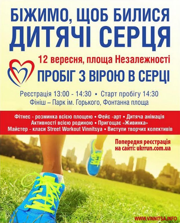 12 вересня в Вінниці втретє відбудеться «Пробіг з вірою в серці» - всеукраїнська щорічна благодійна ініціатива заради здоров'я дитячих сердець. Головна мета акції - зниження смертності дітей з вродженими вадам серця.