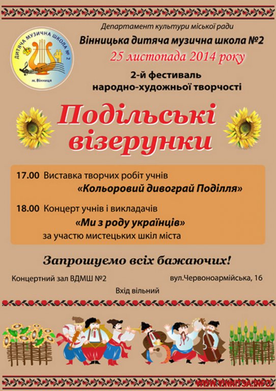 Вперше фестиваль народно-художньої творчості «Подільські візерунки» відбувся у Вінниці у минулому році. Тоді цей захід викликав жвавий інтерес серед вінничан. Цьогоріч, 25 листопада він пройде вдруге. Його організаторами є департамент культури міської ради та Вінницька дитяча музична школа №2.